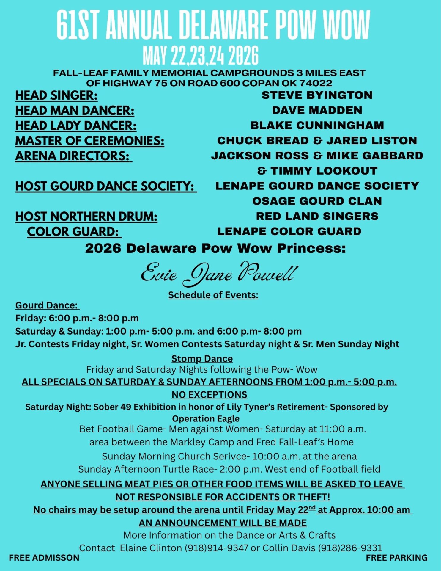 The 61st Annual Delaware Pow Wow will be held May 22-24 at the Fall-Leaf Family Memorial Campgrounds, located 3 miles east of Highway 75 on Road 600, Copan, OK, 74022. See the flyer below for a full schedule of events and other details. Any further questions may be directed to Elaine Clinton (918) 914-9347 or […]