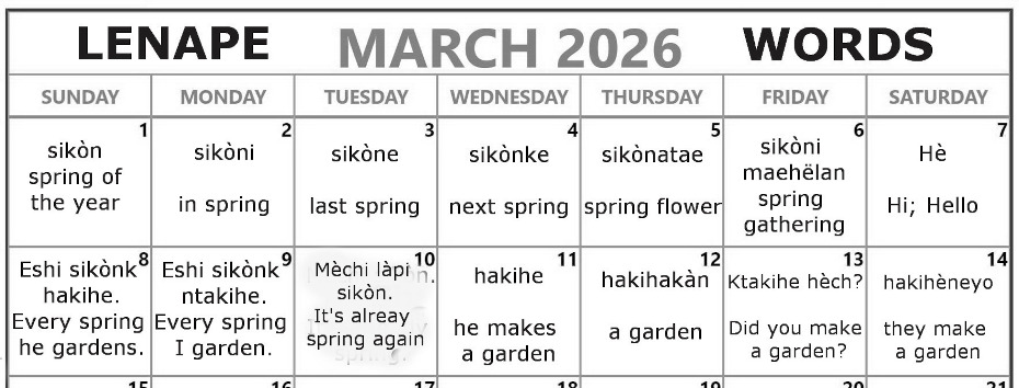March 2026 Lenape Word-a-Day-Calendar