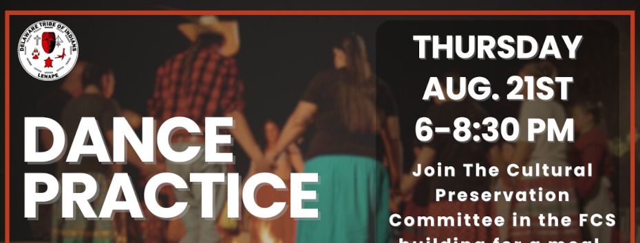 Join the Cultural Preservation Committee in the FCS building on Wednesday July 30 form 6:00-8:30 P.M. and learn about the history of Stomp Dancing among the Lenape, followed by song and dance practice! A meal will be provided.
